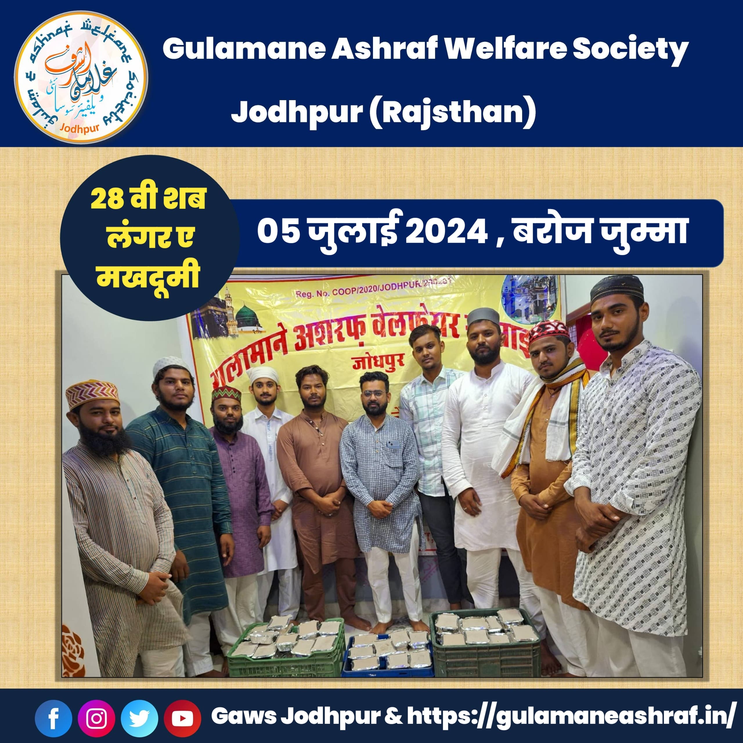 05 जुलाई 2024 बरोज जुम्मा को गुलामाने अशरफ वेलफेयर सोसाइटी जोधपुर के जिम्मेदारानो द्वारा सय्यद नूर मियां साहब अशरफी की सरपरस्ती में लंगर ए मखदूमी का इंतजाम किया गया व जरूरतमंदो को लंगर तकसीम किया गया।