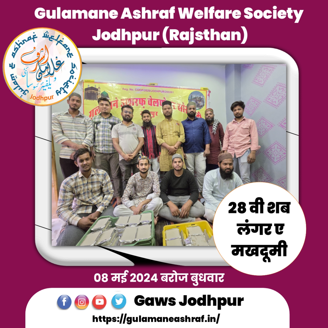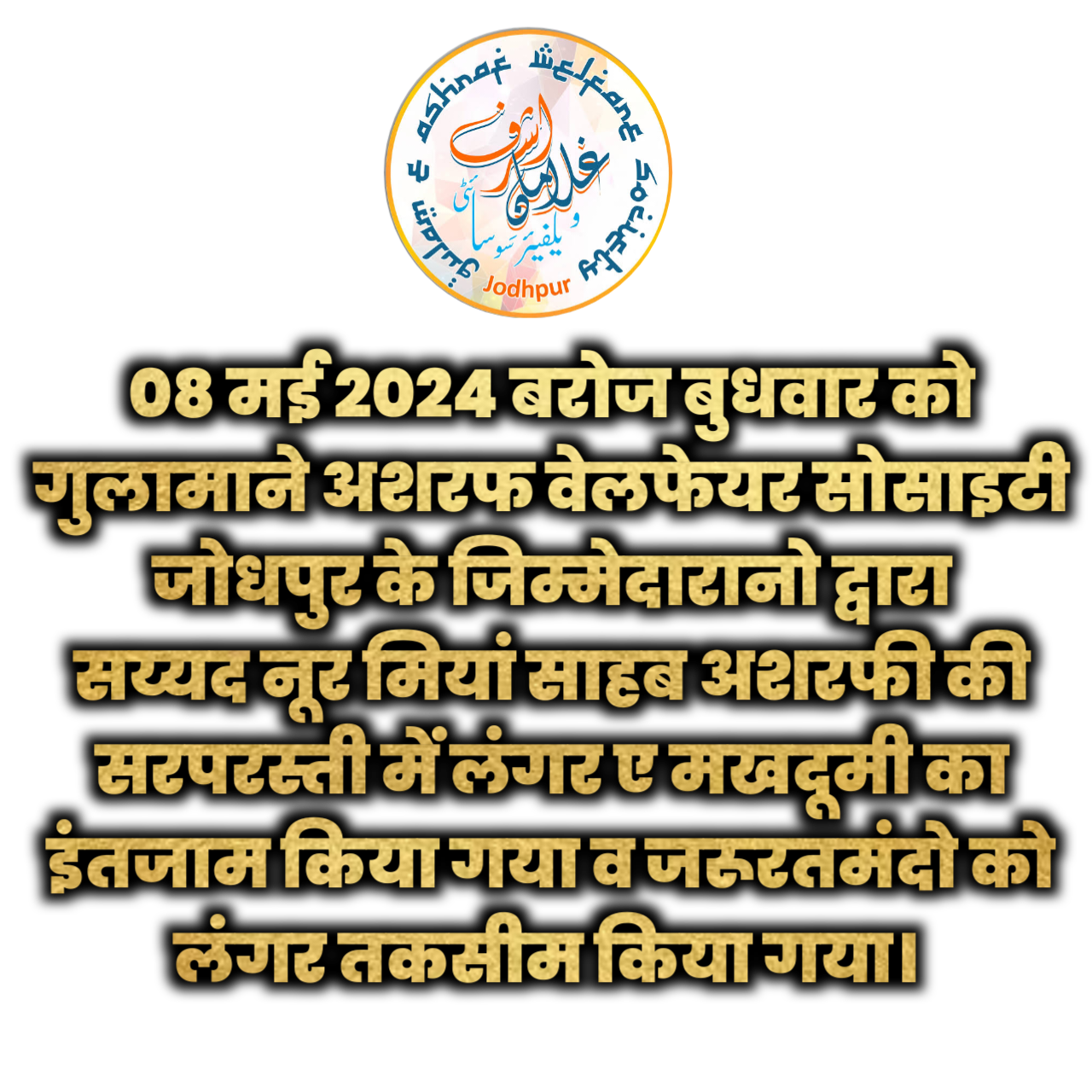 08 मई 2024 बरोज बुधवार को गुलामाने अशरफ वेलफेयर सोसाइटी जोधपुर के जिम्मेदारानो द्वारा सय्यद नूर मियां साहब अशरफी की सरपरस्ती में लंगर ए मखदूमी का इंतजाम किया गया व जरूरतमंदो को लंगर तकसीम किया गया।