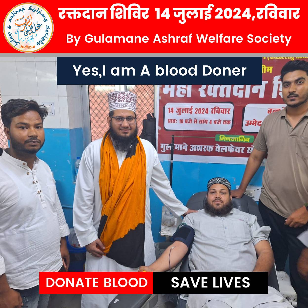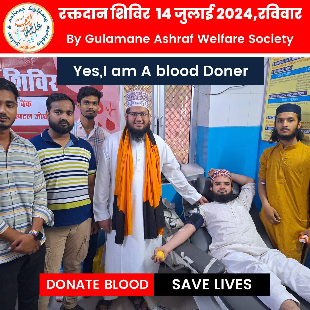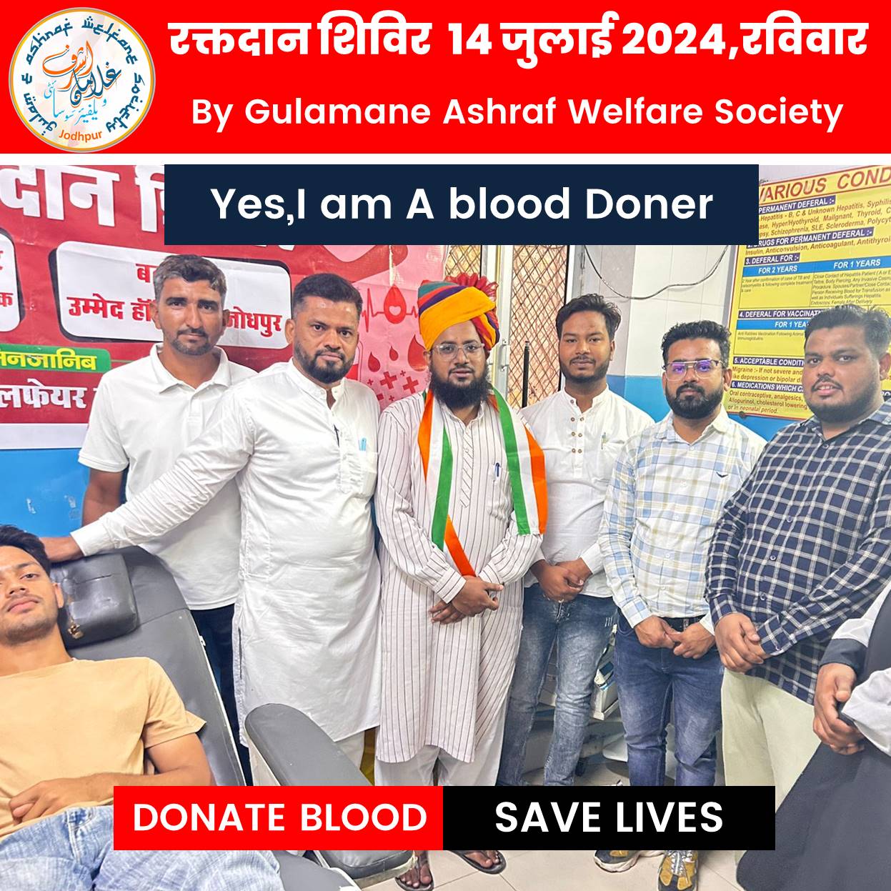 गुलामाने अशरफ वेलफेयर सोसाइटी के तत्वावधान में अध्यक्ष मौलाना सय्यद नूर मियाँ अशरफी के नेतृत्व में शोहादा ए कर्बला की याद में रक्तदान शिविर का आयोजन उम्मेद हॉस्पिटल स्थित ब्लड बैंक में आयोजित किया गया। जिसमें 109 यूनिट एकत्रित हुए, रक्तदाताओं ने बढ़ चढ़कर हिस्सा लिया, सोसायटी द्वारा रक्तदाताओं को सर्टिफिकेट भेंट कर उनकी हौसला अफजाई की गई। उपाध्यक्ष मुख्तार अनीस चिश्ती ने बताया शिविर का आगाज दुआओं के साथ किया गया महमाने खुशुसी (मुख्य अतिथि) उम्मेद हॉस्पिटल के अधीक्षक मोहम्मद अफजल हकीम, हजरत मौलाना बरकत अशरफी मुदर्रिस दारूल उलूम इस्हाकिया, मौलाना फुरकान, पार्षद शेर मोहम्मद, मोहम्मद सिराज नूरी, नूरी इंटरनेशनल स्कूल, पार्षद वसीम मामा मौजूद रहे। सचिव अशरफ हुसैन ने बताया कि शिविर में एकत्रित हुआ 109 यूनिट प्रत्येक रक्तदाताओं को सिपास नामा देकर अभार प्रकट किया। ब्लड बैंक से जुड़े हुए लोगो ने शिविर में शामिल होकर अपनी उपस्थिति महसूस कराई। सोसायटी के अध्यक्ष ने बताया कि रक्तदान शिविर के आयोजन में लोगों ने बढ़ चढ़कर हिस्सा लिया। रक्तदान महादान है जो किसी की जिंदगी बचाकर परिवार को खुशिया दे सकता है। सोसायटी द्वारा कार्य कर रहे सभी लोगो ने रक्तदान कर मानव जीवन बचाने वाले सभी रक्तदाताओं का धन्यवाद किया।