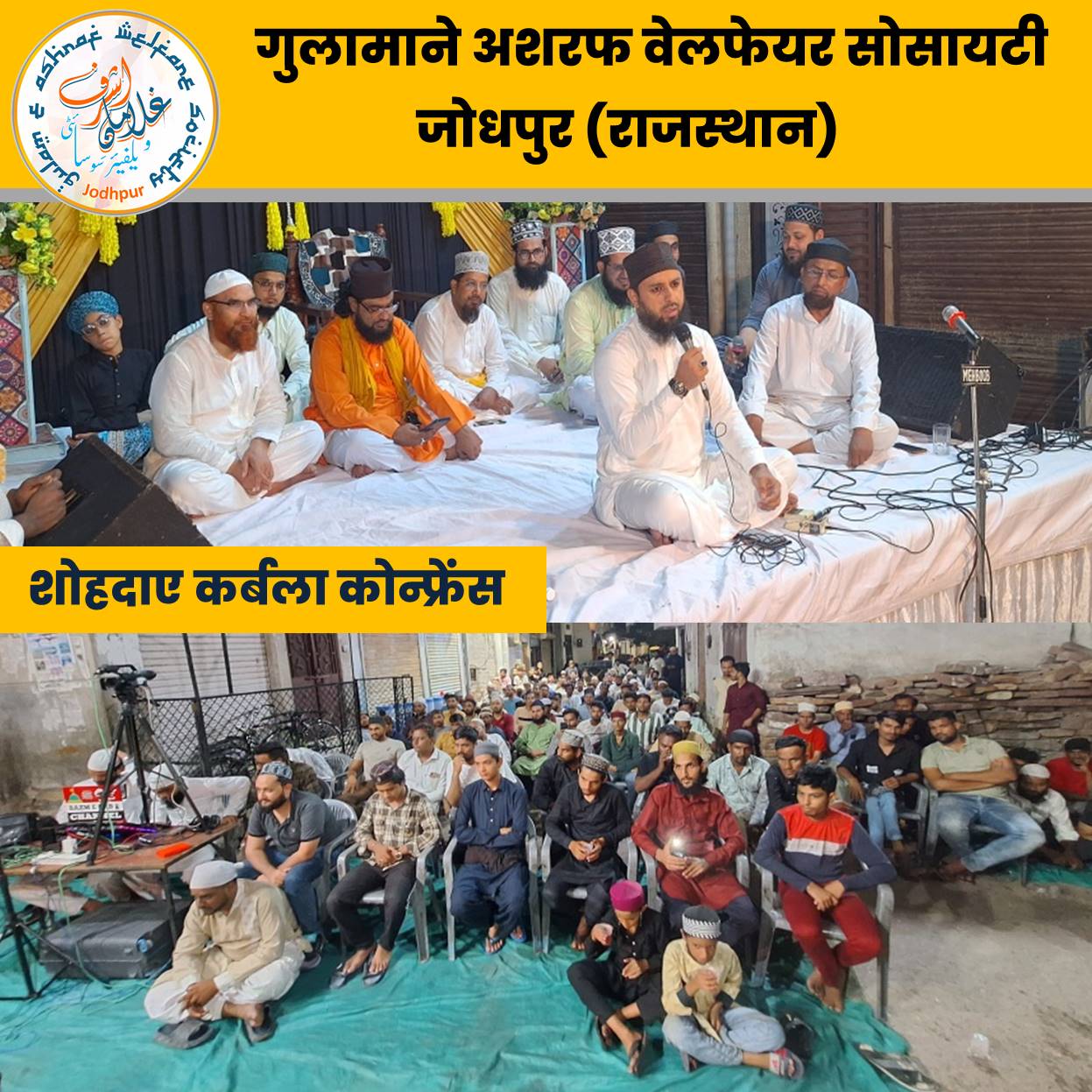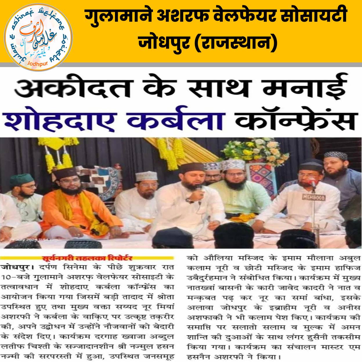जोधपुर दर्पण सिनेमा के पीछे 19 जुलाई 2024 शुक्रवार रात 10-बजे गुलामाने अशरफ वेलफेयर सोसाइटी के तत्वावधान में शोहदाए कर्बला कॉन्फ्रेंस का आयोजन किया गया जिसमें बड़ी तादाद में श्रोता उपस्थित हुए तथा मुख्य वक्ता सय्यद नूर मियां अशरफी ने कर्बला के वाकिए पर उत्कृष्ट तक़रीर की, अपने उद्बोधन में उन्होंने नौजवानों को बेदारी के संदेश दिए। कार्यक्रम दरगाह ख्वाजा अब्दुल लतीफ चिश्ती के सज्जादानशीन श्री नज्मुल हसन नज्मी की सरपरस्ती में हुआ, उपस्थित जनसमूह को औलिया मस्जिद के इमाम मौलाना अबुल कलाम नूरी व छोटी मस्जिद के इमाम हाफिज उबैदुर्रहमान ने संबोधित किया। कार्यक्रम में मुख्य नातख्वां बासनी के कारी जावेद कादरी ने नात व मन्कृबत पढ़ कर नूर का समां बांधा, इसके अलावा जोधपुर के इब्राहीम नूरी व अनीस अशफाकी ने भी कलाम पेश किए। कार्यक्रम की समाप्ति पर सलातो सलाम व मुल्क में अमन शान्ति की दुआओं के साथ लंगर हुसैनी तकसीम किया गया। कार्यक्रम का संचालन मास्टर एम हसनैन अशरफी ने किया।